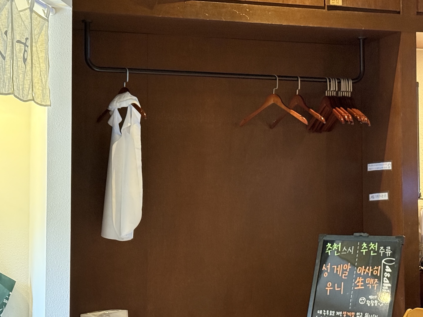 앞치마와 겉옷을 걸어놓을 수 있는 공간으로 가볍게 식사할 수 있다.