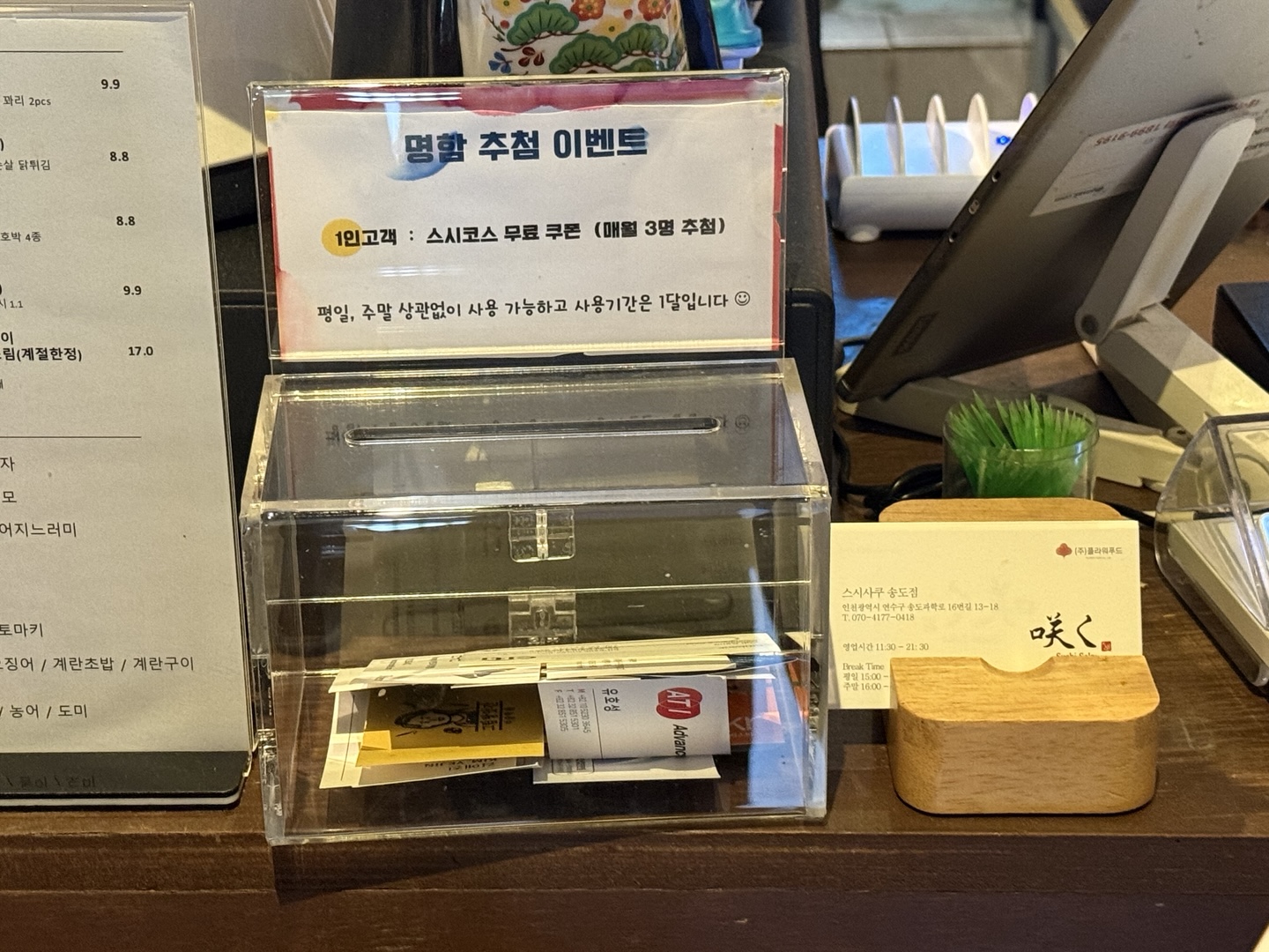 명함 추천 이벤트로 매월 추첨을 통해 스시코스 무료 쿠폰을 3명에게 제공한다!
